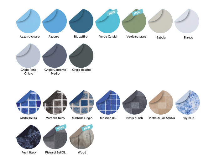 Progettate una piscina su misura che rispecchi davvero il vostro stile, grazie alla grande varietà di motivi e colori del rivestimento. Blu, Sabbia, Grigio chiaro o scuro, persino Bianco o Nero. Moderna e versatile, un liner di qualità è comunque un investimento duraturo. Ancora il rivestimento in PVC 3D dona maggiore stile e prestigio alla vostra piscina, scegliendo tra le numerose proposte e texture.